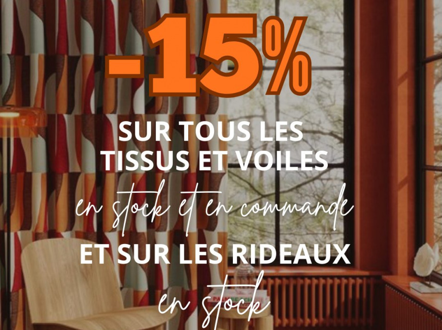 15 avril 20190Comments-15% sur les tissus et voiles pour vos rideaux sur-mesure et sur les rideaux en stock